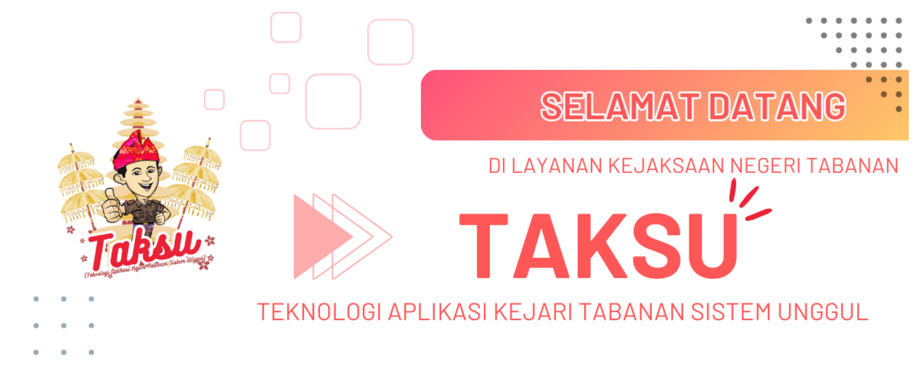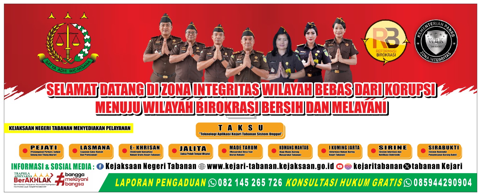 Selamat Datang Di Website Resmi Kejaksaan Negeri Tabanan - Alamat Kantor : Jalan Jenderal Sudirman No. 5, Tabanan, Bali - Telp. 0361-811083, Fax. 0361-811325, WA : 0821-4526-5726, Email : info@kejari-tabanan.go.id